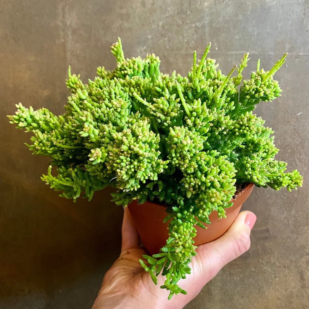 Rhipsalis baccifera (ou cassutha) : Une variété très populaire avec des tiges fines, souvent longues, et des petites baies blanches ou roses. C’est un cactus retombant qui peut atteindre 1,5 mètre de long, parfait pour être suspendu.